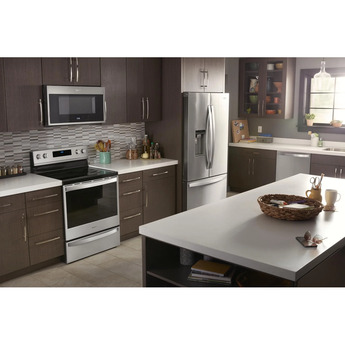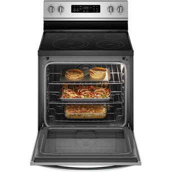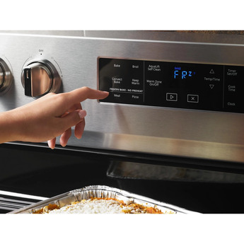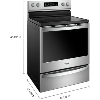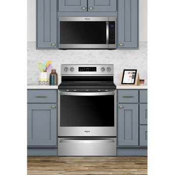 True to name, the Whirlpool-WFE775H0HZ 30" Fingerprint-Resistant Stainless Steel Electric Range - Convection overflows with features, including a five-burner system with adjustable dual-radiant elements to welcome larger pots. On the beautiful ceramic glass smoothtop, simmer with the 100-watt element or quick-boil with 3,000 watts, this fingerprint-defying Whirlpool has both covered. In the spacious 6.4 cu. ft. oven, three racks await your casseroles, turkey or other meal, all prepared evenly via fan convection cooking and temperature-sensing technology up to 3,600 watts. When dinner's done, pop burner knobs into the dishwasher, quick-wipe the cooktop and initiate AquaLift self-cleaning.