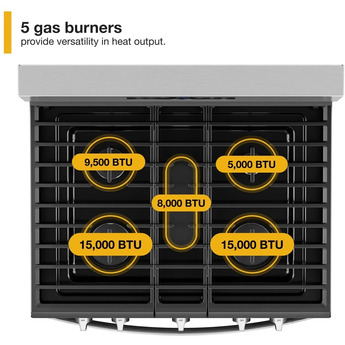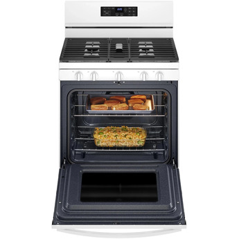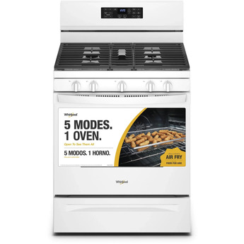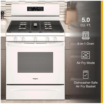 Natural Gas, 5 Sealed Burners, 5.0 cu. ft. Total Oven Capacity, Convection Oven, Edge-to-Edge Self-Cleaning Mode, Storage Drawer, Fan Convection Cooking, Frozen Bake Technology, 5-in-1 Multifunction Oven, Air Fry Mode, SpeedHeat Burner, Adjustable Self-Clean Cycle, Storage Drawer, Center Oval Burner, Cast Iron Grates, UL Certification in White