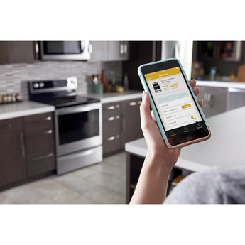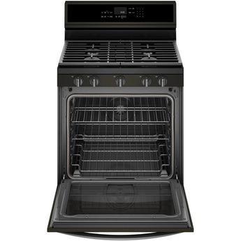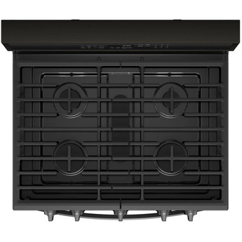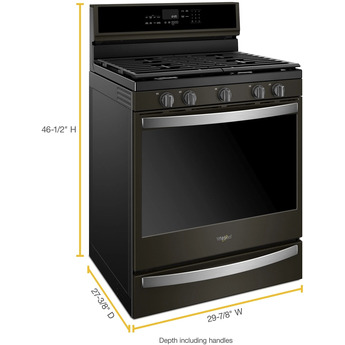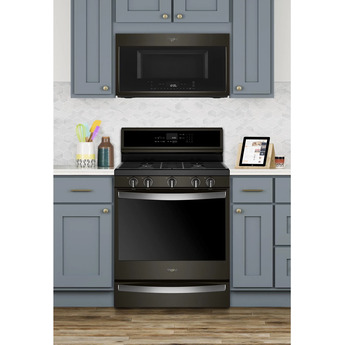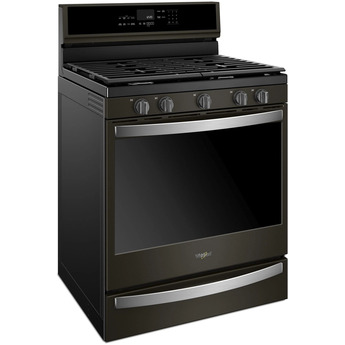 Almost everything about the smartly designed Whirlpool-WFG975H0HV 30" Black Stainless Steel Gas Sealed Burner Range with Griddle – Convection appears larger-than-life, beginning at its cavernous 5.8 cu. ft. stove with AquaLift self-cleaning technology. Atop this night-hued stainless steel steed rides a sealed-burner system with tough-as-nails cast-iron EZ-2-Lift hinged grating (to accommodate seamless clean-up) firing from 5,000 to 18,000 BTUs. Inside, two standard and one max rack supply helpful settings from broil and Sabbath mode to frozen-bake and proofing. Perhaps most amazing of all, this range welcomes smartphone or tablet use to monitor and adjust from afar. Brilliant!