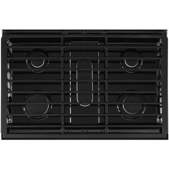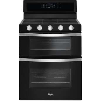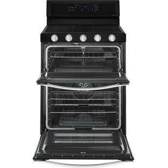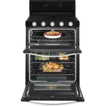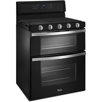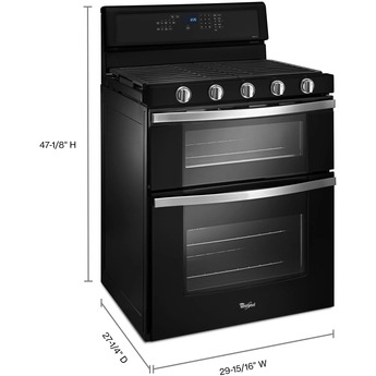 Spend less time cooking and more time enjoying life with the Whirlpool WGG745S0FE 30" Black Gas Double Oven Range. A SpeedHeat burner harness the power of 16,000 BTUs sear and boil at light speed. Your kitchen is sure to be flapjack central thanks to the specially designed oval burner nestled in the center of the cooktop perfect for a removable griddle pan. Continuous cast-iron grates cover the surface from edge-to-edge and lift on hinge for quickly cleaning minor spills, or remove entirely to wash in the dishwasher when major accidents occur. The True Convection oven utilizes three heating elements and convection fan to bake foods faster than ever before and Whirlpool’s FrozenBake technology makes preheating a thing of the past. This double oven dynamo even has the capability to convert traditional recipes into convection recipes, no calculator needed. The Whirlpool WGG745S0FE is truly built with the busy home cook in mind.