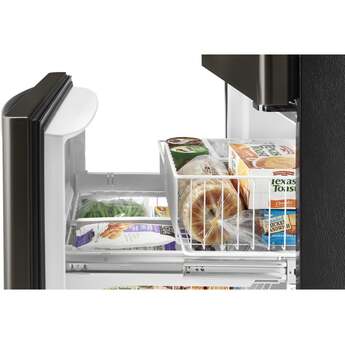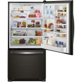 This bottom freezer refrigerator from Whirlpool comes equipped with a deli drawer so you can organize and store plenty of meat and cheese for snack time. Two humidity-controlled crispers keep your produce fresh and crisp for longer. This unit's Accu-Chill Temperature Management System cools food quickly with technology that sense and adapts to create the ideal environment for food. Your groceries are in good hands.