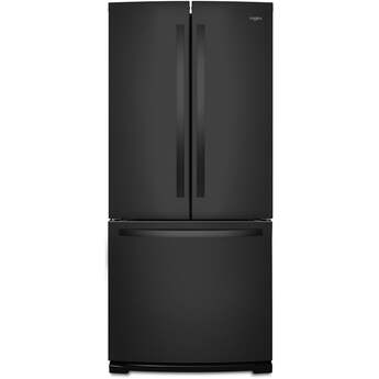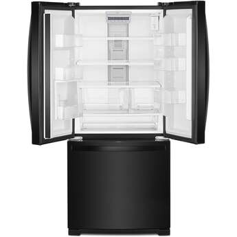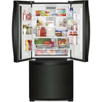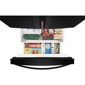 An innovative shelf inside the Whirlpool-WRF560SMHV 19.7 Cu. Ft. Black French Door Refrigerator - Energy Star model has a sliding adjustment mechanism that accommodates two-liter bottles or other bulky containers while keeping them out of the way of other items. Also, this refrigerator has two crisper drawers of different sizes; each features a humidity selector for customizable results. The full-width pantry section is an excellent place to store vegetable trays or sheet cakes, and it offers manual temperature controls.