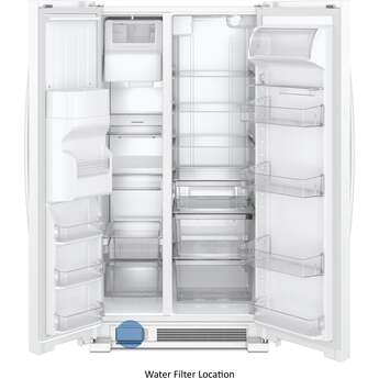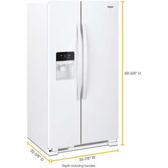 The smartly designed Whirlpool-WRS325SDHW 24.6 Cu. Ft. White Side-by-Side Refrigerator features frameless shelves that provide plentiful storage space and ample surface area for large or awkwardly sized items. There are also built-in storage compartments inside the door; store bottles or cans inside them to free up space elsewhere. Some of the door storage options have adjustable designs, giving them even more flexibility. The refrigerator's shiny finish doesn't show smudges or fingerprint and the concealed hinges on the door provide an appealing look.